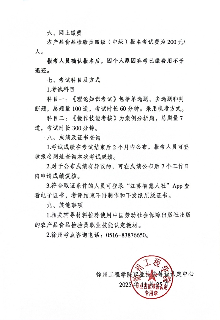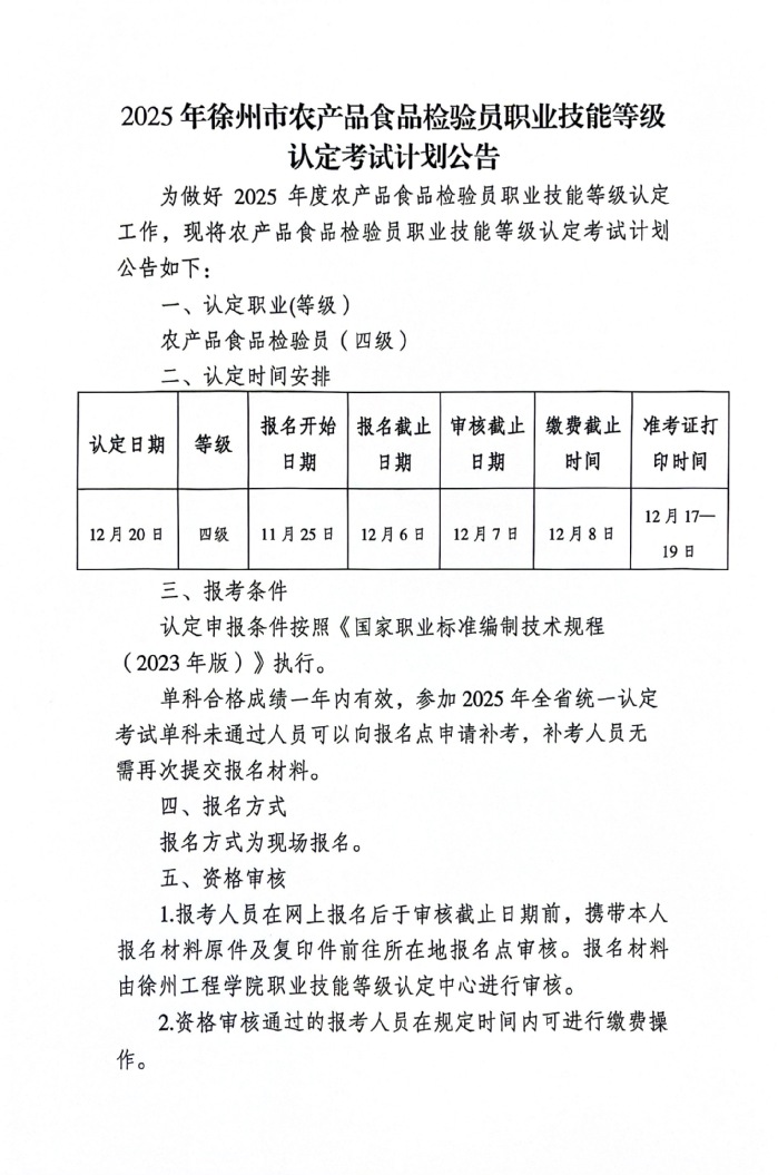2025年徐州市农产品食品检验员职业技能等级认定考试计划公告