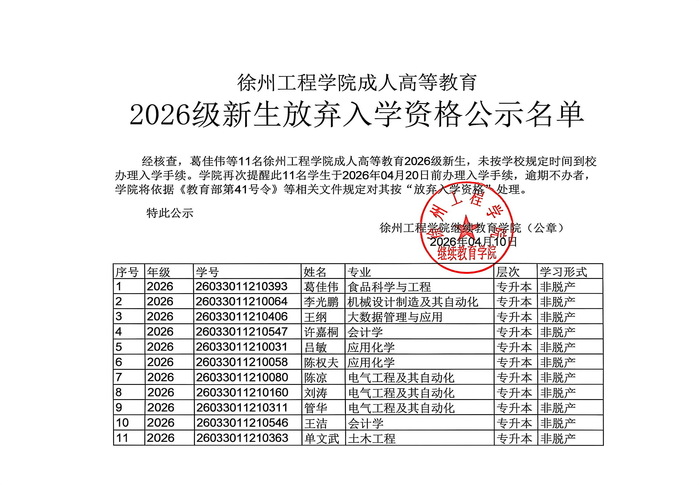 徐州工程学院成人高等教育2026级新生放弃入学资格公示名单